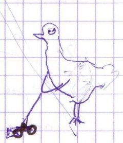 Hum voilà à quoi s'arrête les dessins faits avec un ami dans un cours (qui devait être) passionnant de psychologie (car je suis en L2 de psycho). Nous avions imaginé un déambulateur à roulettes pour poule déséquilibré... au moment du dessin reste à savoir qui étaient les plus déséquilibraient de la poule ou des dessinateurs... Ecartez les enfants ça peut choquer...